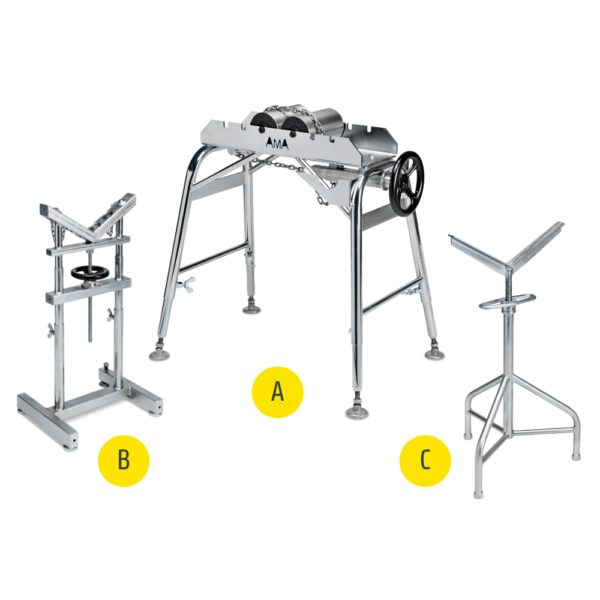 AMA Pipe Stands A, B, and C are fully adjustable and easy to move, allowing operators to position pipes exactly where they need them.