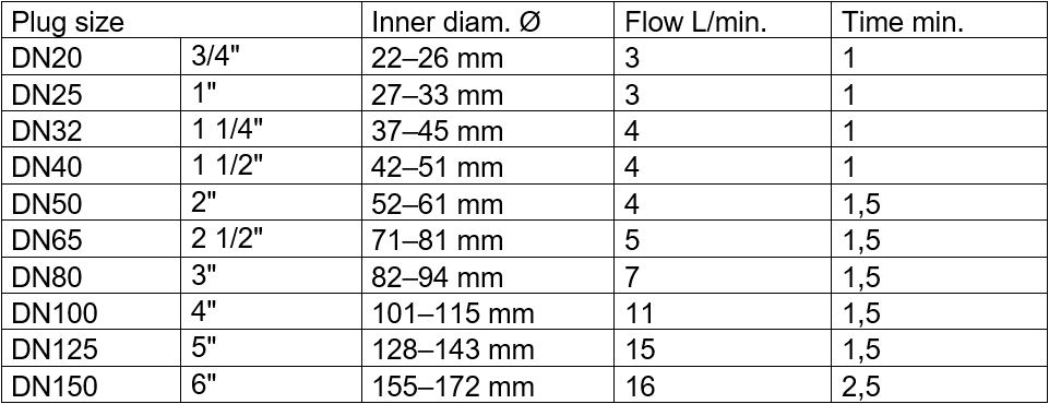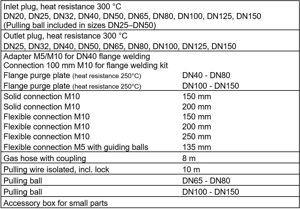 - The kit includes silicone purge plugs, sizes DN20 (3/4″) – DN150 (6″)