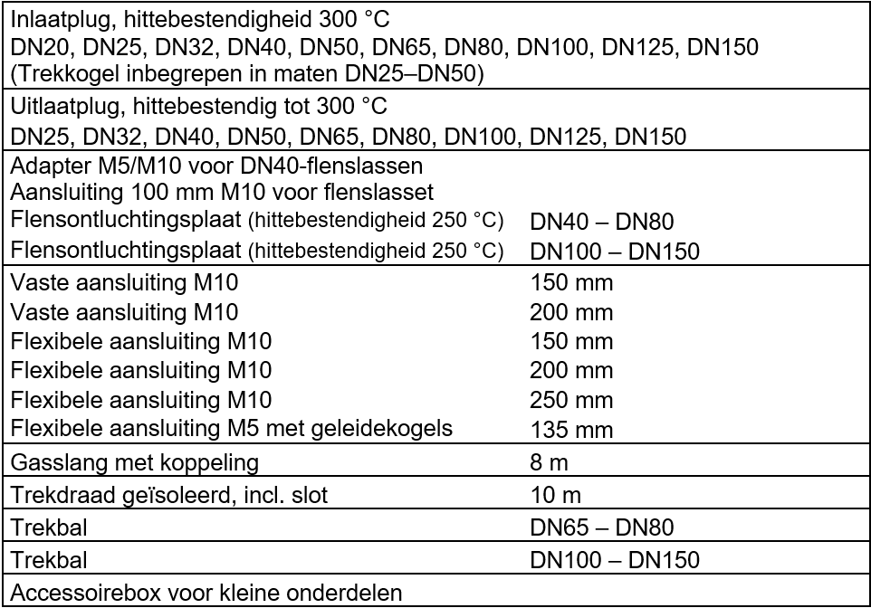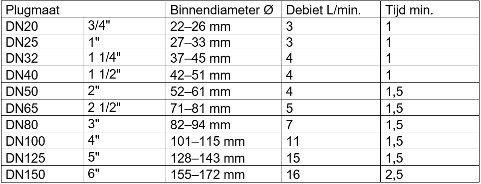 - De kit bevat siliconen spoelpluggen, maten DN20 (3/4″) – DN150 (6″)