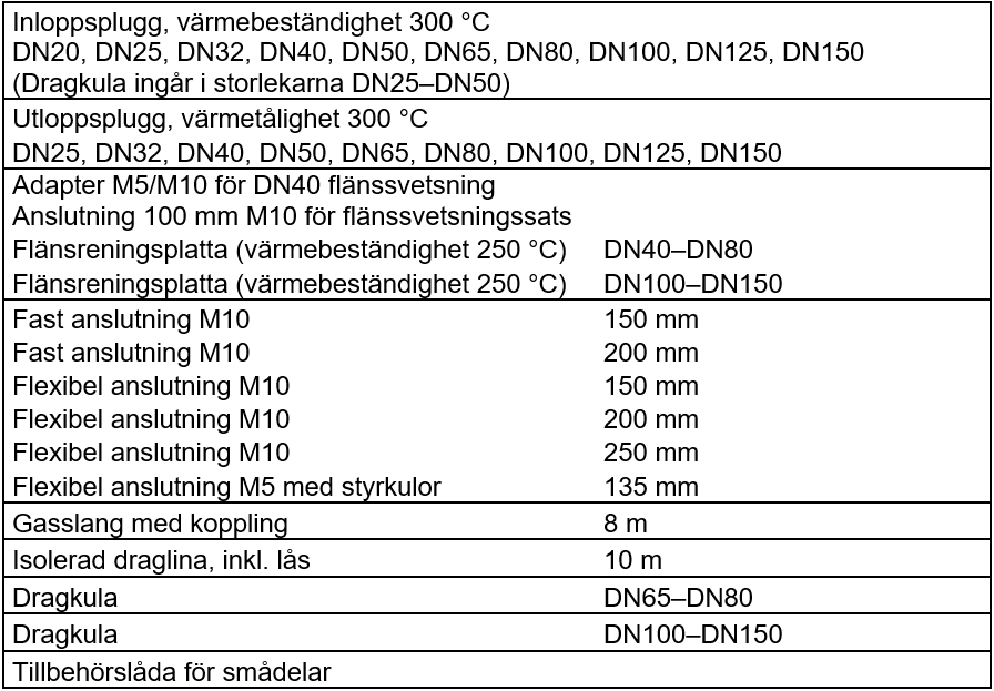 - Satsen innehåller silikonrensningspluggar i storlekarna DN20 (3/4″) – DN150 (6″)